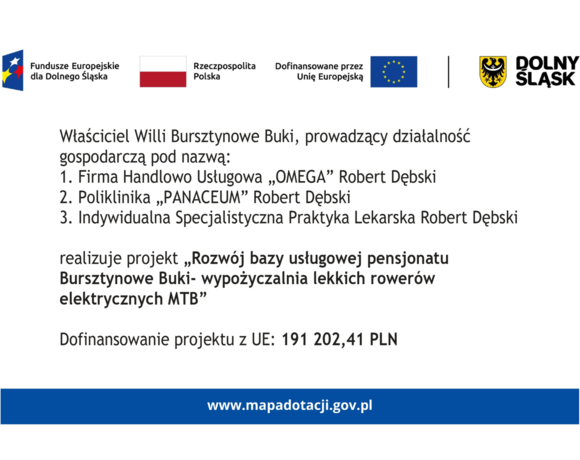 Właściciel Willi Bursztynowe Buki, prowadzący działalność gospodarczą pod nazwą: 1. Firma Handlowo Usługowa "OMEGA" Robert Dębski 2. Poliklinika PANACEUM Robert Dębski 3. Indywidualna Specjalistyczna Praktyka Lekarska Robert Dębski realizuje projekt dofinansowany z Funduszy Europejskich. Tytuł projektu: „Rozwój bazy usługowej pensjonatu Bursztynowe Buki- wypożyczalnia lekkich rowerów elektrycznych MTB”. Projekt obejmuje realizację jednego zadania, związanego z zakupem dziesięciu sztuk lekkich rowerów elektrycznych MTB oraz wdrożenie do oferty produktowej innowacyjnej w skali przedsiębiorstwa usługi wynajmu lekkich rowerów elektrycznych MTB. Projekt skierowany jest przede wszystkim do turystów uprawiających turystykę rowerową na terytorium powiatu kłodzkiego, w tym osób o słabszej kondycji fizycznej. Celem projektu jest wzrost konkurencyjności oraz innowacyjności przedsiębiorstwa Roberta Dębskiego, działającego w obszarze zrównoważonej turystyki, poprzezwdrożenie innowacyjnej w skali przedsiębiorstwa usługi wynajmu lekkich rowerów elektrycznych MTB, co pozwoli na wzrost jego konkurencyjnej pozycji w regionie. Powyższe doprowadzi również do wzrostu atrakcyjności turystycznej regionu wałbrzyskiego. Wartość projektu: 335 970,00 PLN Wysokość wkładu z Funduszy Europejskich: 191 202,41PLN